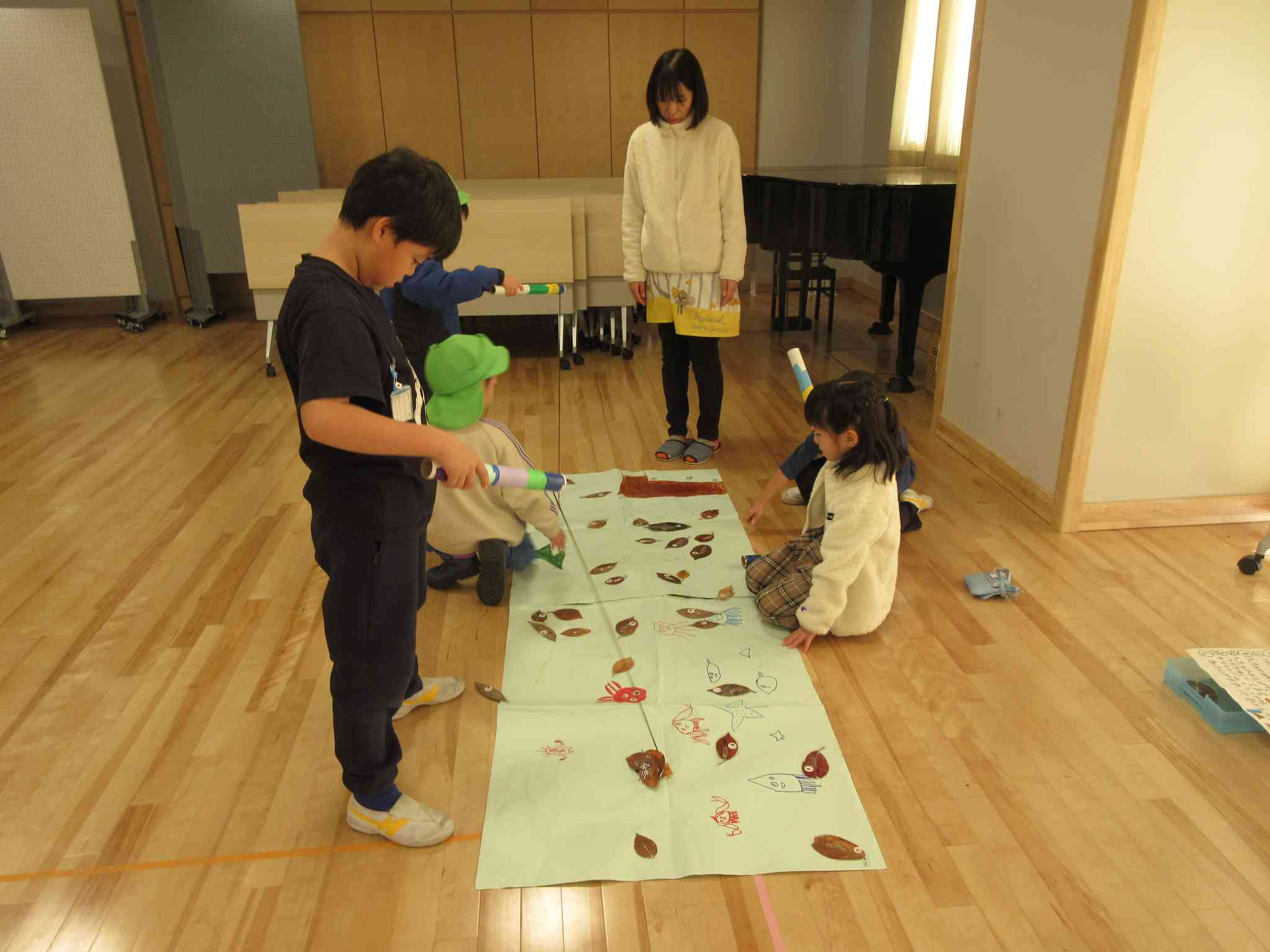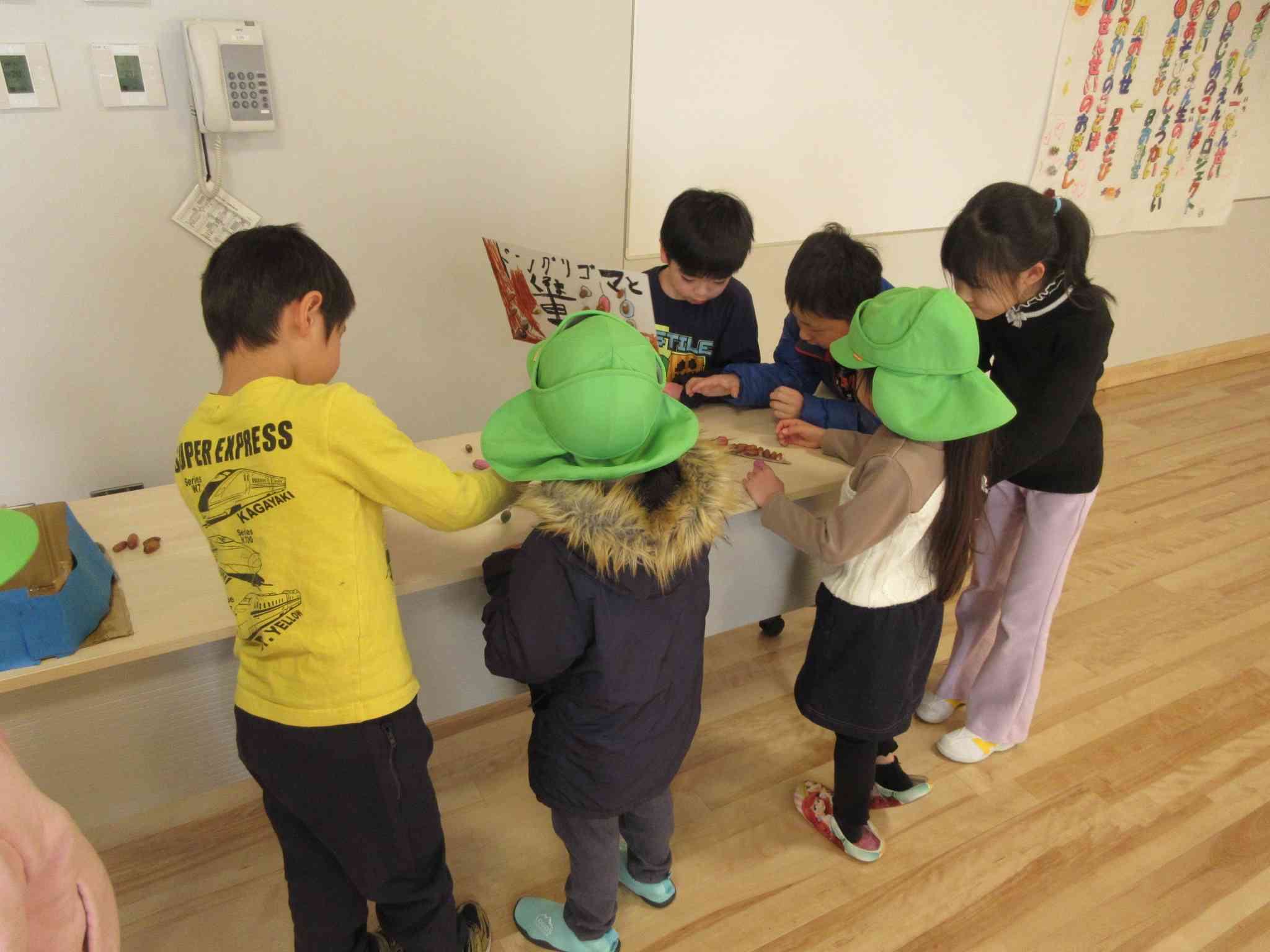 近くの保育園の年長さんを招待して、おもちゃ大会を行いました。お店番の時は、おもちゃの遊び方を優しく教えてあげたり、お世話をしたりしていました。みんな、とても頼もしい姿を見せていました。年長さんに喜んで貰って、1年生みんなに誇らしい満足の笑顔が見られました。また、1つお兄さん、お姉さんになった気がします。